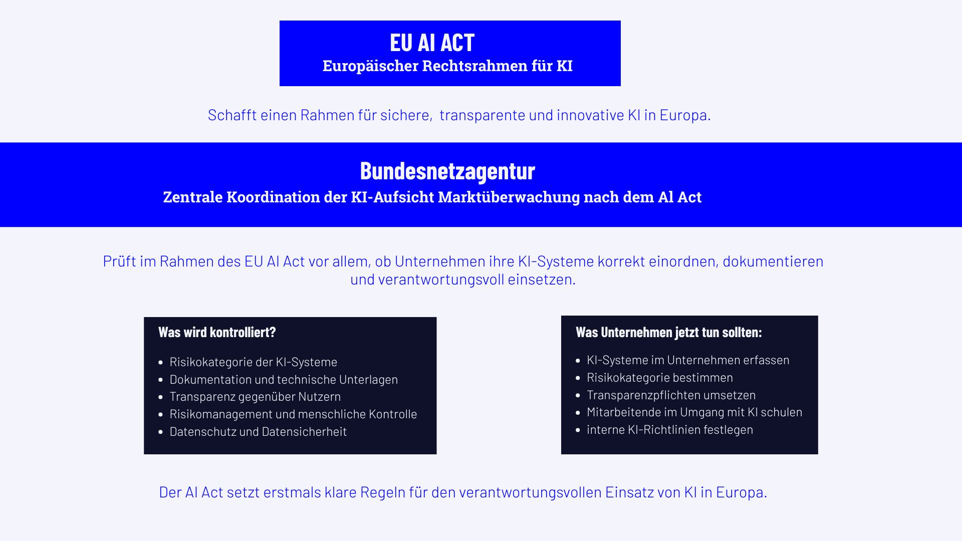 Gleichzeitig bleibt es beim sogenannten „One-Stop-Shop mit Fachaufsicht“: In regulierten Branchen behalten spezialisierte Behörden ihre Zuständigkeit – etwa die BaFin im Finanzsektor oder Datenschutzbehörden bei DSGVO-Fragen. Die Bundesnetzagentur übernimmt die Koordination und Marktüberwachung im Sinne des AI Act.